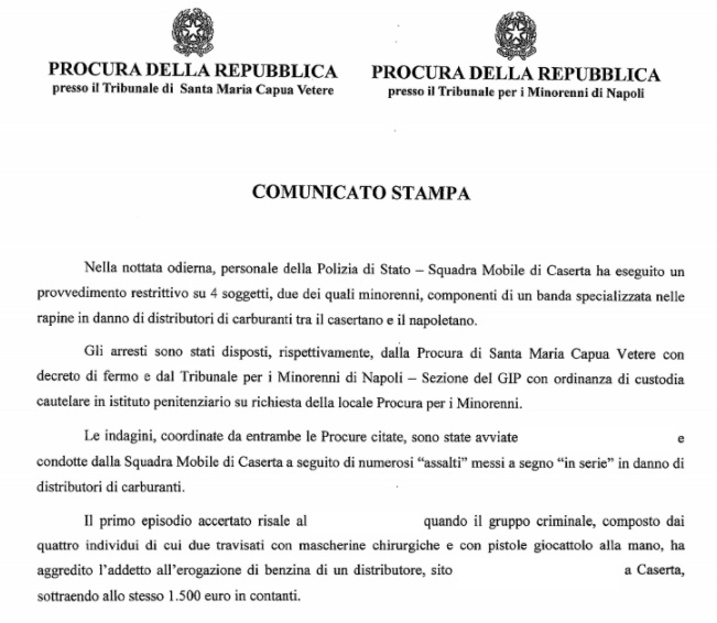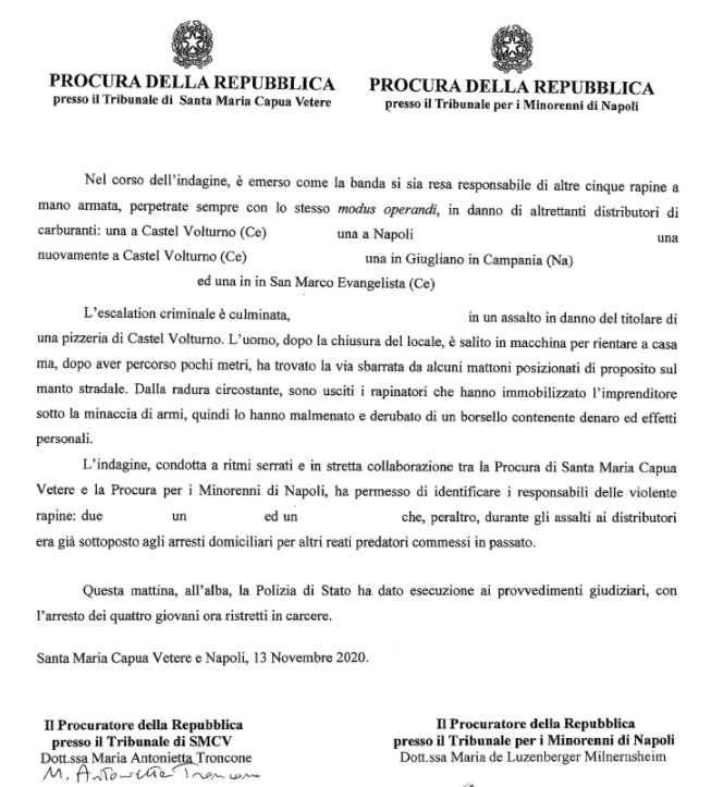 CE/C.Volturno/S.Marco Ev./NA/Giugliano. "Banda specializzata nelle rapine in danno di distributori". 4 nei guai