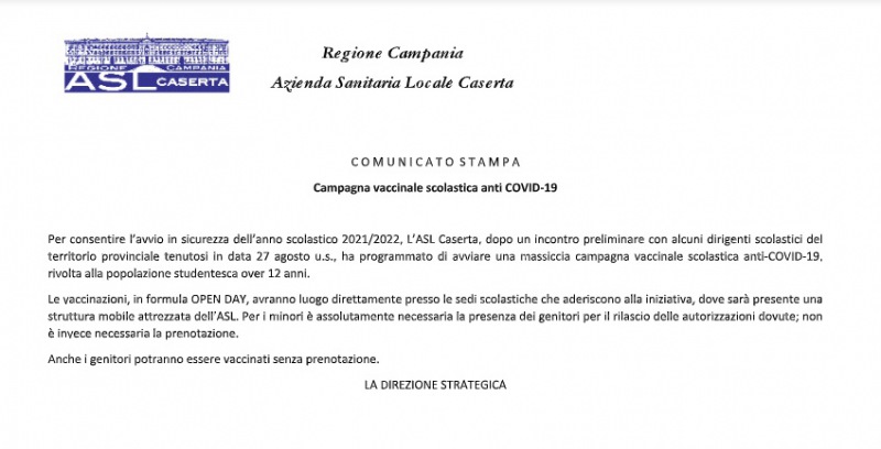 "Campagna vaccinale scolastica anti COVID-19. Per consentire l’avvio in sicurezza dell’anno scolastico 2021/2022, L’ASL Caserta, dopo un incontro preliminare con alcuni dirigenti scolastici del territorio provinciale tenutosi in data 27 agosto u.s., ha programmato di avviare- si legge nella nota- una massiccia campagna vaccinale scolastica anti-COVID-19, rivolta alla popolazione studentesca over 12 anni. Le vaccinazioni, in formula OPEN DAY, avranno luogo direttamente presso le sedi scolastiche che aderiscono alla iniziativa, dove sarà presente una struttura mobile attrezzata dell’ASL. Per i minori- si legge nella nota- è assolutamente necessaria la presenza dei genitori per il rilascio delle autorizzazioni dovute; non è invece necessaria la prenotazione. Anche i genitori potranno essere vaccinati senza prenotazione."