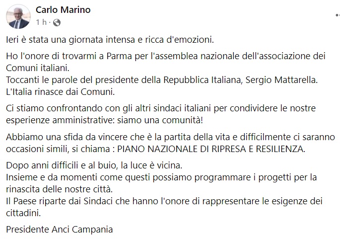 Questo quanto apprendiamo dalla pagina fb del Sindaco Carlo Marino: "Ieri è stata una giornata intensa e ricca d'emozioni. Ho l'onore di trovarmi a Parma per l'assemblea nazionale dell'associazione dei Comuni italiani. Toccanti le parole del presidente della Repubblica Italiana, Sergio Mattarella. L'Italia rinasce dai Comuni. Ci stiamo confrontando con gli altri sindaci italiani - si legge nella nota - per condividere le nostre esperienze amministrative: siamo una comunità! Abbiamo una sfida da vincere che è la partita della vita e difficilmente ci saranno occasioni simili, si chiama: PIANO NAZIONALE DI RIPRESA E RESILIENZA. Dopo anni difficili e al buio, la luce è vicina. Insieme e da momenti come questi possiamo programmare i progetti per la rinascita delle nostre città. Il Paese riparte dai Sindaci che hanno l'onore di rappresentare le esigenze dei cittadini. Presidente Anci Campania".