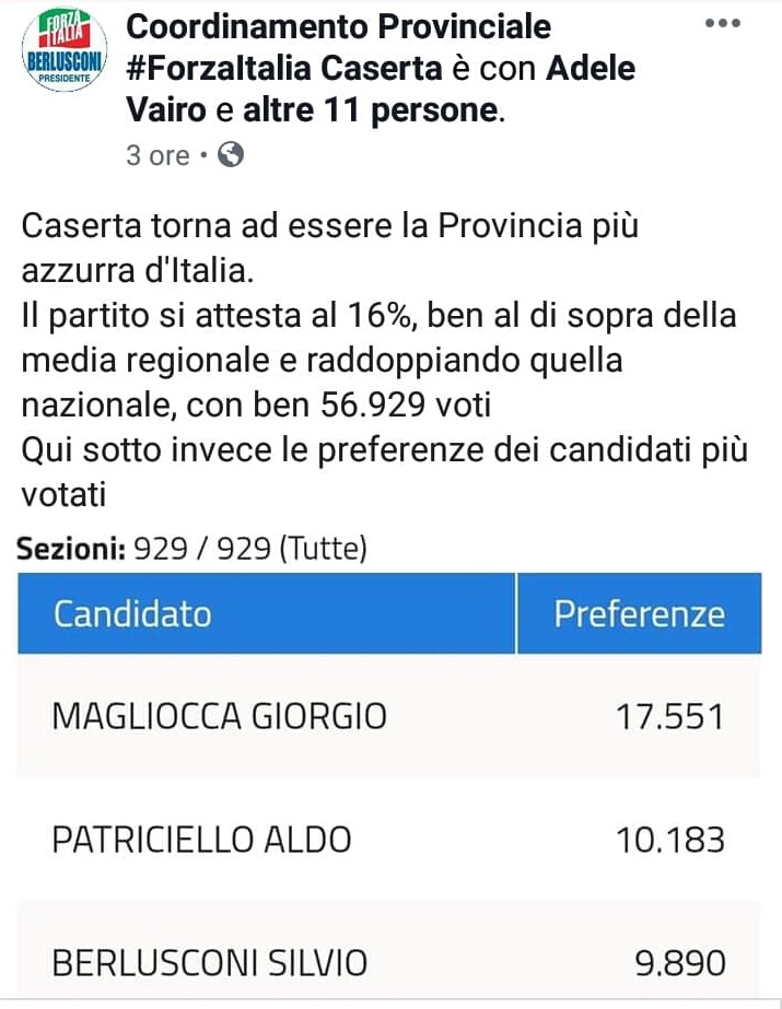 Questo il commento del Coordinamento Provinciale di Forza Italia a Caserta dopo le elezioni Europee