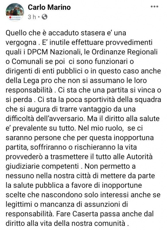 Queste le dichiarazioni del Sindaco Marino sulla gara Casertana-Viterbese pubblicate sul suo profilo fb