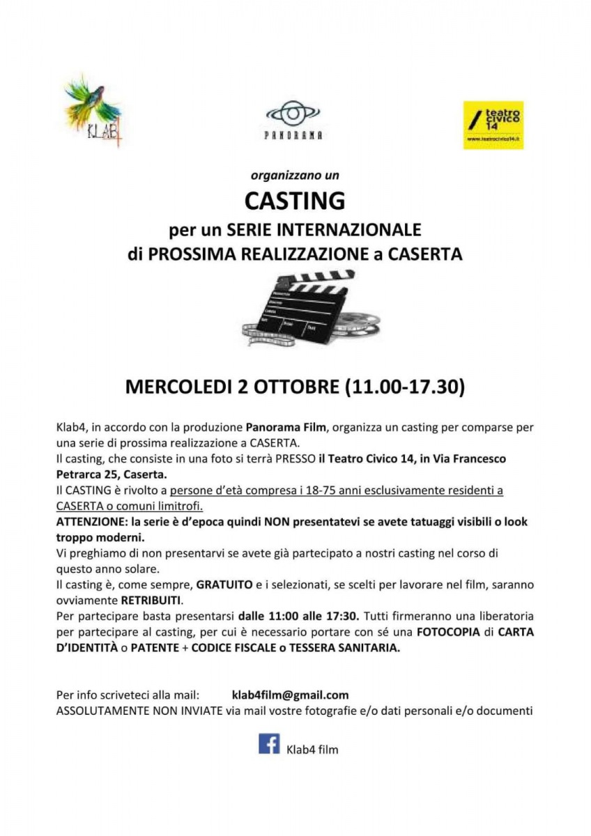 Oggi, mercoledì 2 ottobre, è previsto un casting per una serie televisiva di prossima realizzazione presso il Teatro Civico 14 a Caserta. La serie a carattere internazionale sarà girata in abiti d'epoca. Di seguito maggiori informazioni.