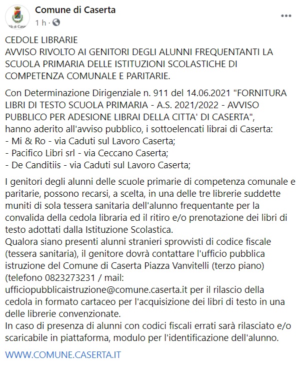 "CEDOLE LIBRARIE. AVVISO RIVOLTO AI GENITORI DEGLI ALUNNI FREQUENTANTI LA SCUOLA PRIMARIA DELLE ISTITUZIONI SCOLASTICHE DI COMPETENZA COMUNALE E PARITARIE. Con Determinazione Dirigenziale n. 911 del 14.06.2021 "FORNITURA LIBRI DI TESTO SCUOLA PRIMARIA - A.S. 2021/2022 - AVVISO PUBBLICO PER ADESIONE LIBRAI DELLA CITTA' DI CASERTA", hanno aderito- si legge nella nota- all'avviso pubblico, i sottoelencati librai di Caserta: - Mi & Ro - via Caduti sul Lavoro Caserta; - Pacifico Libri srl - via Ceccano Caserta; - De Canditiis - via Caduti sul Lavoro Caserta; I genitori degli alunni delle scuole primarie di competenza comunale e paritarie, possono recarsi, a scelta, in una delle tre librerie suddette muniti di sola tessera sanitaria dell'alunno frequentante per la convalida della cedola libraria ed il ritiro e/o prenotazione dei libri di testo adottati dalla Istituzione Scolastica. Qualora siano presenti alunni stranieri sprovvisti di codice fiscale (tessera sanitaria), il genitore dovrà contattare l'ufficio pubblica istruzione del Comune di Caserta Piazza Vanvitelli (terzo piano) (telefono 0823273231 / mail: [email protected] per il rilascio della cedola in formato cartaceo per l'acquisizione dei libri di testo in una delle librerie convenzionate. In caso di presenza di alunni con codici fiscali errati- si legge nella nota- sarà rilasciato e/o scaricabile in piattaforma, modulo per l'identificazione dell'alunno. WWW.COMUNE.CASERTA.IT"