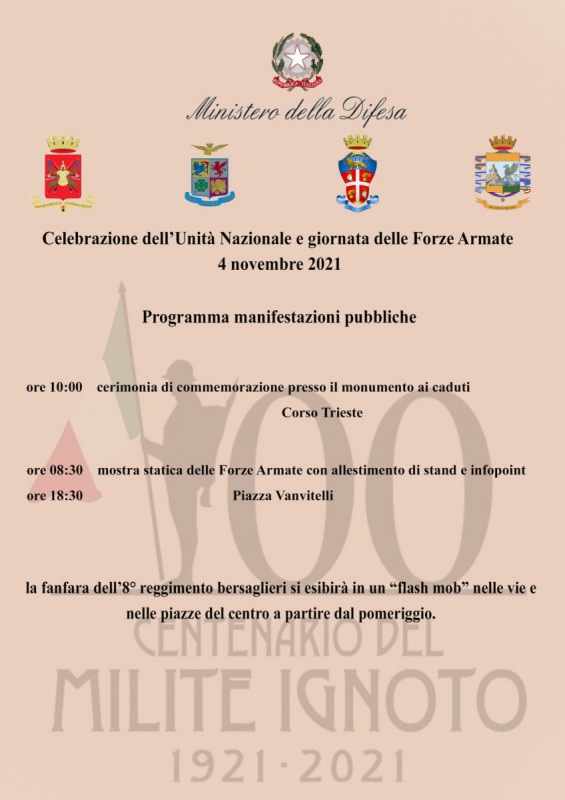 "Celebrazione della giornata del 4 Novembre Festa delle FORZE ARMATE. Nell’ambito delle iniziative tese alla celebrazione del “100° anniversario della traslazione della salma del Milite Ignoto”, per rievocare lo storico viaggio della salma del soldato sconosciuto divenuto simbolo dei tanti caduti durante la Prima Guerra Mondiale, lo Stato Maggiore della DIFESA per l’anno 2021 ha ripristinato, ancorché parzialmente, le celebrazioni pubbliche per la giornata della Festa delle Forze Armate. L’evento, che si svolgerà nella giornata di giovedì vedrà coinvolti- si legge nella nota- ESERCITO, AERONAUTICA MILITARE , Arma dei CARABINIERI e Corpo della Guardia di Finanza, secondo il programma della Locandina in allegato alla presente nota stampa. La giornata sarà dedicata alla commemorazione degli eventi storici del passato e alla promozione delle opportunità professionali per il futuro. Ancorché in forma ridotta e tenendo in considerazione le limitazioni imposte dalla legislazione vigente a contrasto della pandemia da COVID 19 si invita la cittadinanza a partecipare."