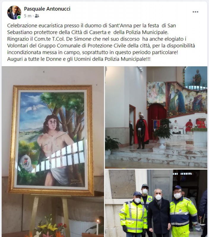 Questo quanto pubblicato sulla pagina fb del Cons. Comunale di Caserta Pasquale Antonucci: "Celebrazione eucaristica presso il duomo di Sant'Anna per la festa di San Sebastiano protettore della Città di Caserta - si legge nella nota - e della Polizia Municipale. Ringrazio il Com.te T.Col. De Simone che nel suo discorso ha anche elogiato i Volontari del Gruppo Comunale di Protezione Civile della città - si legge nella nota -, per la disponibilità incondizionata messa in campo, soprattutto in questo periodo particolare! Auguri a tutte le Donne e gli Uomini della Polizia Municipale!!!"