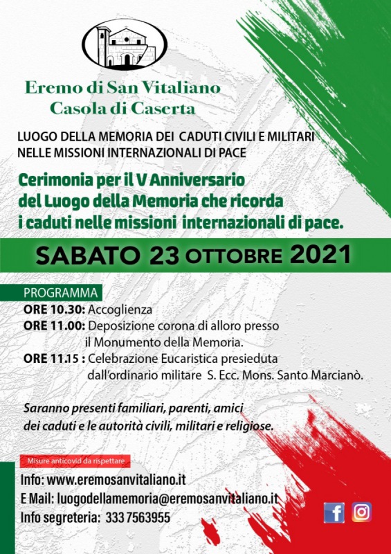 Nella giornata di sabato 23 ottobre, dalle ore 10.30, presso l'Eremo di San Vitaliano a Casola di Caserta si terrà una cerimonia per il V Anniversario del Luogo della Memoria che ricorda i caduti nelle missioni internazionali di pace. All'evento saranno presenti il Sottosegretario alla Difesa On. Mulè, il Vescovo Lagnese, i Vertici Militari della FA di Caserta, il Comandante di COMFOPSUD Gen. Tota, il Sindaco Marino ed il Ten. Col. Gianfranco Paglia.