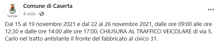 Questo quanto apprendiamo dalla pagina facebook del Comune di Caserta: