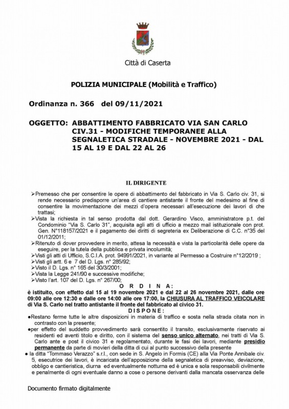 "Dal 15 al 19 novembre 2021 e dal 22 al 26 novembre 2021, dalle ore 09:00 alle ore 12:30 e dalle ore 14:00 alle ore 17:00, CHIUSURA AL TRAFFICO VEICOLARE di via S. Carlo nel tratto antistante il fronte del fabbricato al civico 31."
