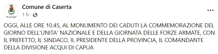 Questo quanto apprendiamo dalla pagina fb del Comune di Caserta: "OGGi, ALLE ORE 10.45, AL MONUMENTO DEI CADUTI LA COMMEMORAZIONE DEL GIORNO DELL'UNITA' NAZIONALE E DELLA GIORNATA DELLE FORZE ARMATE, CON IL PREFETTO, IL SINDACO, IL PRESIDENTE DELLA PROVINCIA, IL COMANDANTE DELLA DIVISIONE ACQUI DI CAPUA".