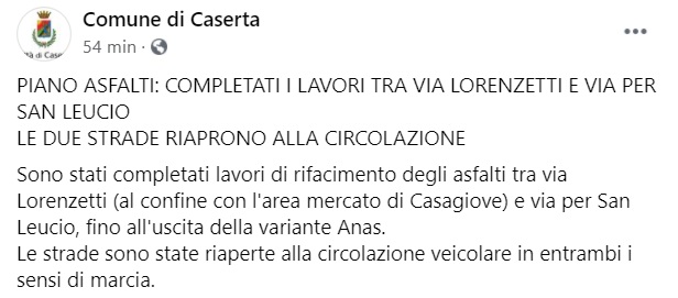 Questo quanto apprendiamo dalla pagina facebook del Comune di Caserta: