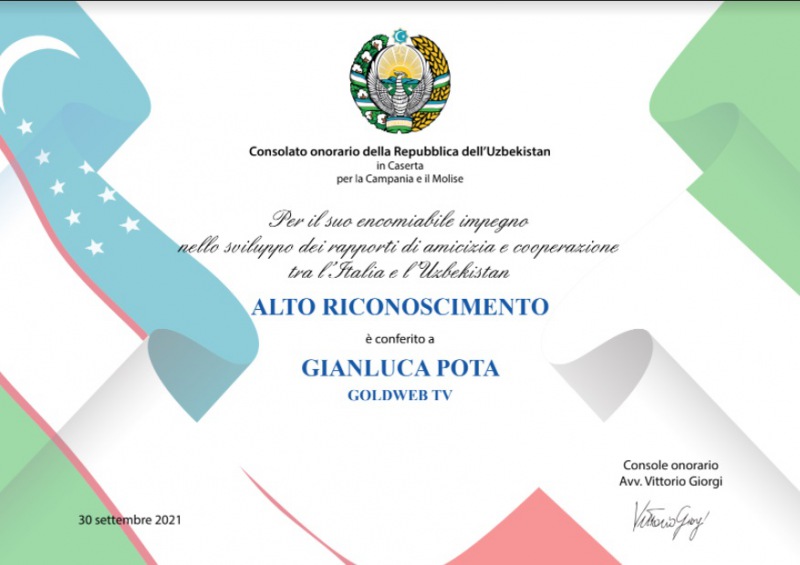 Prestigioso riconoscimento conferito dal Consolato onorario della Repubblica dell’Uzbekistan in Caserta al Direttore del nostro sito di informazione Gianluca Pota. La motivazione è la seguente: "per il suo encomiabile impegno nello sviluppo dei rapporti di amicizia e cooperazione tra l’Italia e l’Uzbekistan". Complimenti da tutta la redazione di Goldweb Tv al nostro Direttore.