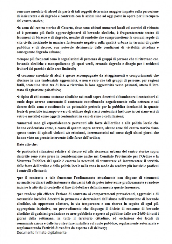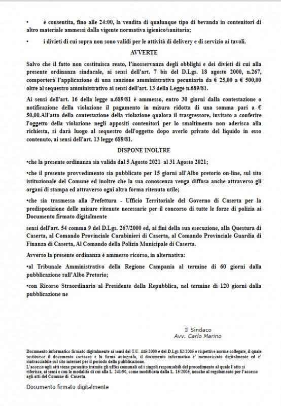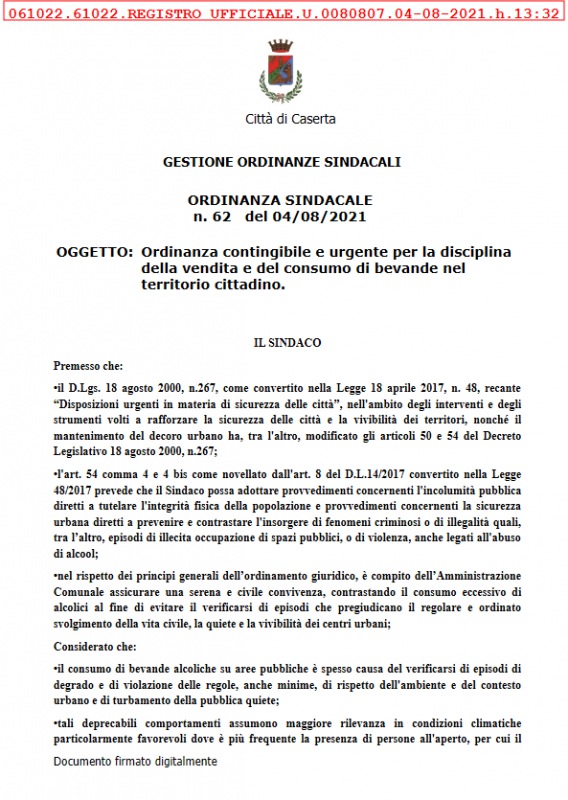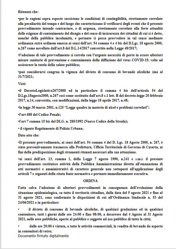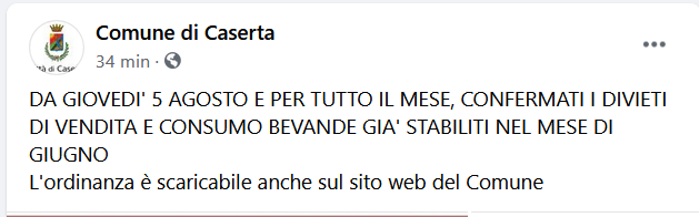 Questo il post pubblicato sulla pagina Facebook del Comune di Caserta: "DA GIOVEDI' 5 AGOSTO E PER TUTTO IL MESE, CONFERMATI I DIVIETI DI VENDITA E CONSUMO BEVANDE GIA' STABILITI NEL MESE DI GIUGNO. L'ordinanza - si legge - è scaricabile anche sul sito web del Comune".