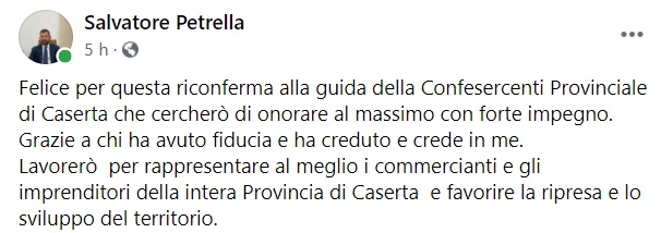 Questo quanto apprendiamo dalla pagina fb del Presidente Confesercenti Caserta: "Felice per questa riconferma alla guida della Confesercenti Provinciale di Caserta che cercherò di onorare al massimo con forte impegno. Grazie a chi ha avuto fiducia - si legge nella nota - e ha creduto e crede in me. Lavorerò per rappresentare al meglio i commercianti e gli imprenditori della intera Provincia di Caserta e favorire la ripresa e lo sviluppo del territorio."
