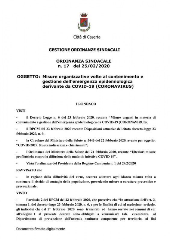 "ORDINANZA SINDACALE N. 17/2020 Misure organizzative volte al contenimento e gestione dell'emergenza epidemiologica derivante da COVID-19 (CORONAVIRUS)".