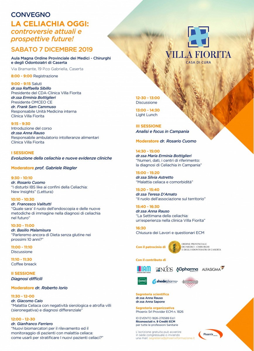 Pubblichiamo nota stampa di Villa Fiorita: "“LA CELIACHIA OGGI: controversie attuali e prospettive future!”, domani sabato 7 convegno nell’Aula Magna dell’Ordine dei Medici di Caserta. Su iniziativa di Anna Rauso, Responsabile dell’ambulatorio di intolleranze alimentari della Clinica Villa Fiorita di Capua, esperti e specialisti si confronteranno sul mondo della celiachia alla luce delle ultime acquisizioni scientifiche. Evoluzione della celiachia e nuove evidenze cliniche, diagnosi difficili, analisi e focus in Campania - si legge nella nota - sono i temi delle diverse sessioni del convegno dal titolo “La Celiachia oggi: controversie attuali e prospettive future!”, promosso dalla Casa di Cura Villa Fiorita di Capua per la giornata di domani, sabato 7 dicembre, nell’aula magna dell’Ordine provinciale dei Medici – Chirurghi e degli Odontoiatri di Caserta che ha concesso il patrocinio all’iniziativa. Coordinata da Anna Rauso, responsabile dell’ambulatorio sulle intolleranze alimentari della Clinica capuana, la giornata di approfondimento vedrà sia al mattino che al pomeriggio confrontarsi diversi specialisti ed esperti, appartenenti fra gli altri all’Università degli Studi di Napoli e al Policlinico partenopeo, e all’Associazione Italiana Celiachia, sezione Campania, su una patologia che colpisce un numero sempre maggiore di persone, talvolta scoperta in età adulta, “Il convegno che terremo presso l’Ordine dei Medici di Caserta consentirà ai colleghi partecipanti di affrontare tutti gli aspetti che riguardano la celiachia e del suo management - si legge nella nota -: dalle recenti novità normative a livello Europeo e nazionale alle ultime acquisizioni scientifiche per rendere la vita del paziente celiaco, oltre che più semplice, migliore”, dichiara Raffaella Sibillo, presidente del CdA di Villa Fiorita di Capua, che aprirà i lavori insieme ad Erminia Bottiglieri, presidente OMCEO CE, chiamata successivamente anche a tenere un intervento nell’ultima sessione. “Una rigorosa e permanente dieta senza glutine è, ad oggi, l’unico trattamento disponibile per la malattia celiaca. Infatti, solo l’esclusione totale e per tutta la vita del glutine dalla dieta permette, nella maggior parte dei casi la remissione dei sintomi e dei segni associati alla malattia celiaca, la normalizzazione dei livelli plasmatici di auto-anticorpi e delle lesione della mucosa duodenale glutine-