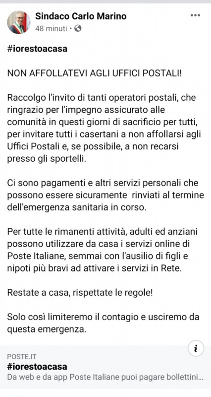Raccolgo l'invito di tanti operatori postali, che ringrazio per l'impegno assicurato alle comunità in questi giorni di sacrificio per tutti, per invitare tutti i casertani a non affollarsi agli Uffici Postali e, se possibile, a non recarsi presso gli sportelli. Ci sono pagamenti e altri servizi personali che possono essere sicuramente rinviati al termine dell'emergenza sanitaria in corso. Per tutte le rimanenti attività, adulti ed anziani possono utilizzare da casa i servizi online di Poste Italiane, semmai con l'ausilio di figli e nipoti più bravi ad attivare i servizi in Rete. Restate a casa, rispettate le regole! Solo così limiteremo il contagio e usciremo da questa emergenza."