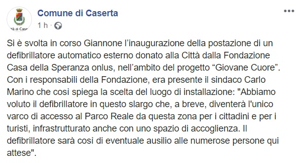 Questo quanto pubblicato sulla pagina facebook del Comune di Caserta: