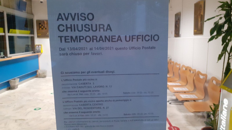 Come si evince dall'avviso posto sulla porta di ingresso dell'ufficio, domani, 13 aprile, e dopodomani, 14 aprile, la posta di Corso Giannone a Caserta restera' chiusa tutta la giornata per lavori.