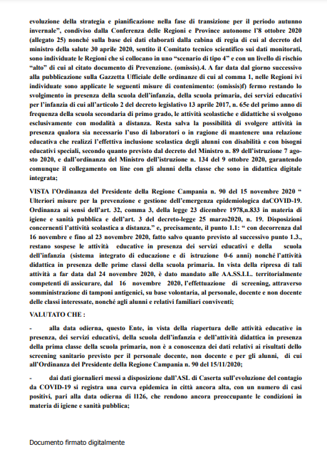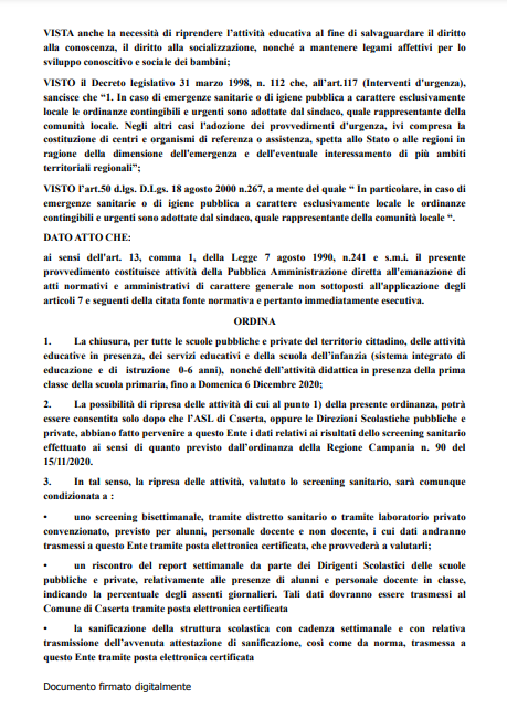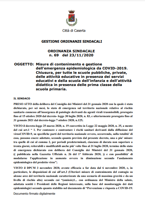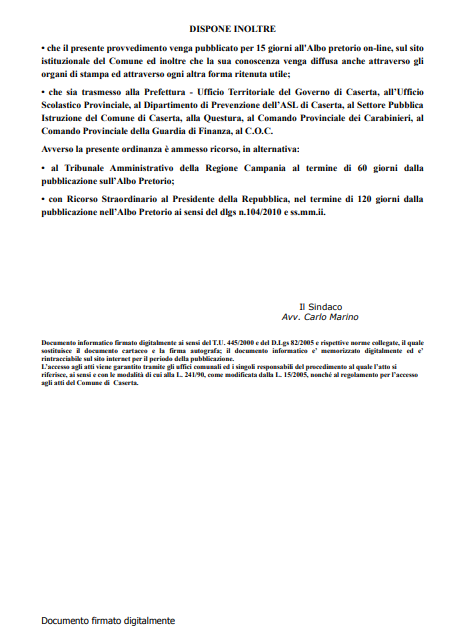 Di seguito, il testo del comunicato, contenente l'Ordinanza del Comune di Caserta, giunto in redazione.