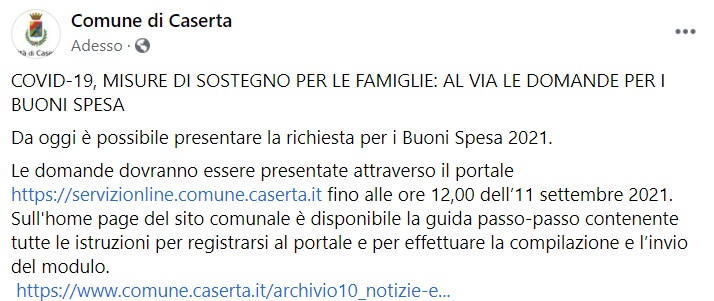 "COVID-19, MISURE DI SOSTEGNO PER LE FAMIGLIE: AL VIA LE DOMANDE PER I BUONI SPESA. Da oggi è possibile presentare la richiesta per i Buoni Spesa 2021. Le domande dovranno essere presentate- si legge nella nota- attraverso il portale https://servizionline.comune.caserta.it fino alle ore 12,00 dell’11 settembre 2021. Sull'home page del sito comunale è disponibile la guida passo-passo contenente tutte le istruzioni per registrarsi al portale e per effettuare la compilazione e l’invio del modulo."