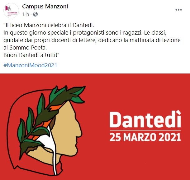“Il liceo Manzoni celebra il Dantedì. In questo giorno speciale i protagonisti sono i ragazzi. Le classi, guidate dai propri docenti di lettere, dedicano- si legge nella nota- la mattinata di lezione al Sommo Poeta. Buon Dantedì a tutti!”