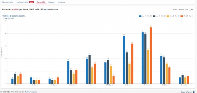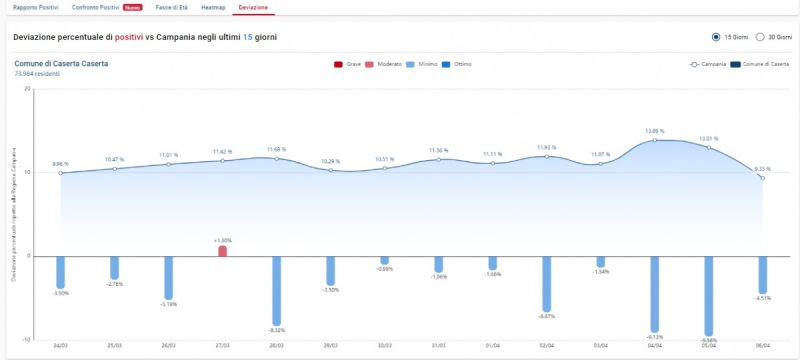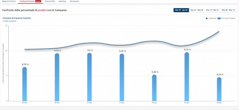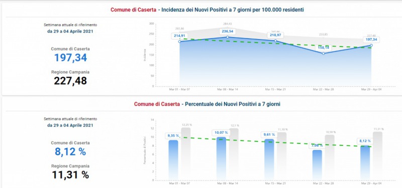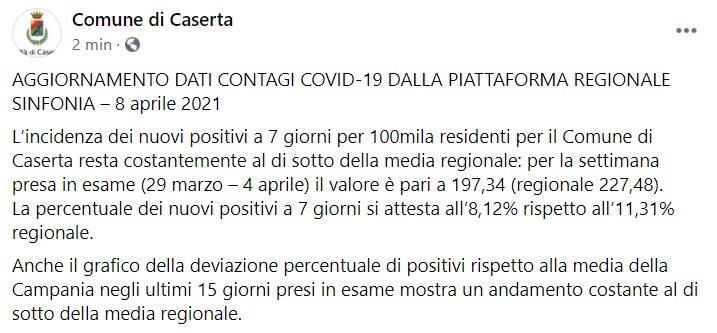 Questo quanto pubblicato sulla pagina fb del Comune di Caserta: "AGGIORNAMENTO DATI CONTAGI COVID-19 DALLA PIATTAFORMA REGIONALE SINFONIA – 8 aprile 2021 L’incidenza dei nuovi positivi a 7 giorni per 100mila residenti per il Comune di Caserta resta - si legge nella nota - costantemente al di sotto della media regionale: per la settimana presa in esame (29 marzo – 4 aprile) il valore è pari a 197,34 (regionale 227,48). La percentuale dei nuovi positivi a 7 giorni si attesta all’8,12% rispetto all’11,31% regionale. Anche il grafico della deviazione percentuale di positivi rispetto alla media della Campania negli ultimi 15 giorni - si legge nella nota - presi in esame mostra un andamento costante al di sotto della media regionale."