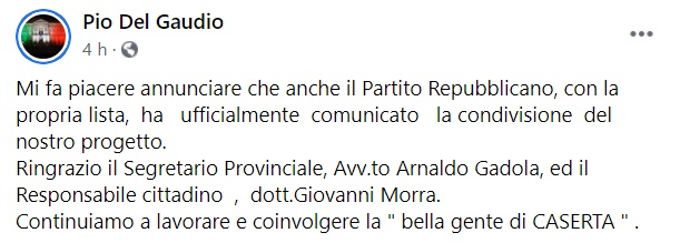 Mi fa piacere annunciare che anche il Partito Repubblicano, con la propria lista, ha ufficialmente comunicato la condivisione del nostro progetto. Ringrazio- si legge nella nota- il Segretario Provinciale, Avv.to Arnaldo Gadola, ed il Responsabile cittadino, dott.Giovanni Morra. Continuiamo a lavorare e coinvolgere la " bella gente di CASERTA " .