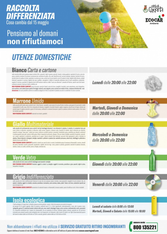 "DIFFERENZIATA, AL VIA IL NUOVO SERVIZIO. PARTITA LA RACCOLTA NOTTURNA, ISOLE ECOLOGICHE APERTE ANCHE SABATO POMERIGGIO. DAL 15 MAGGIO VARIAZIONI NEI GIORNI DI CONFERIMENTO “Una nuova raccolta differenziata che aggiorna e migliora quanto fatto negli anni scorsi con l’obiettivo di dare ulteriore slancio ad un servizio fondamentale per la città. L’obiettivo è incrementare sempre più la qualità- si legge nella nota- e le percentuali di riciclo dei rifiuti urbani, ma anche ottimizzare le modalità di raccolta per venire incontro alle esigenze dei cittadini”. Lo ha detto il sindaco Carlo Marino, commentando l’avvio del nuovo servizio gestito dalla Ecocar che prevede alcune modifiche: già dal 1° maggio la raccolta viene effettuata in gran parte della città in orario notturno in modo da non incidere sulla circolazione veicolare; dal prossimo 8 maggio le isole ecologiche saranno aperte anche di sabato pomeriggio dalle 15 alle 18; è stata avviata la sostituituzione di tutti i cassonetti danneggiati. Dal 15 maggio prossimo ci saranno importanti modifiche anche al calendario di conferimento dei rifiuti (come da locandina allegata) con l’indifferrenziato ridotto- si legge nella nota- ad un solo giorno di raccolta ed il contestuale raddoppio dei giorni dedicati al multimateriale. Previsto anche un nuovo serizio di ritiro dedicato di “pannolini e pannoloni”(3 giorni alla settimana), previa prenotazione tramite telefono o mail."