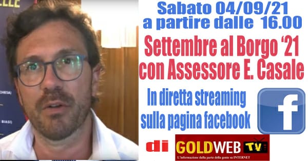 Domani sabato 4 settembre, alle ore 16:00, si terrà in diretta streaming, l'intervista all'Assessore al Comune di Caserta Emiliano Casale, sulla pagina facebook Gold WebTv. Durante la diretta sarà presentata 49esima edizione dell'evento "Settembre al Borgo", con tutte le novità del programma.