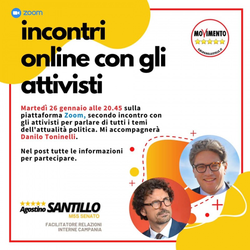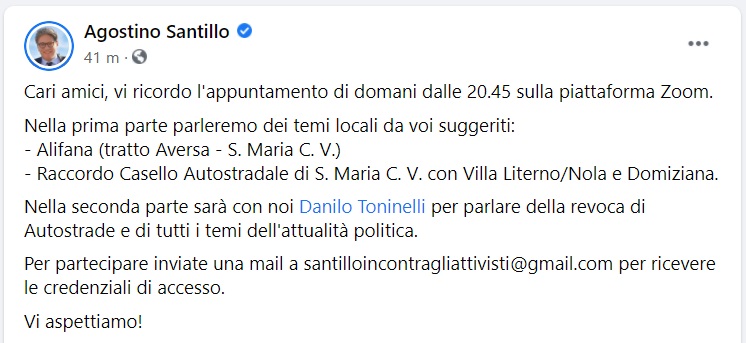 Questo quanto pubblicato sulla pagina fb del Senatore Santillo: "Cari amici, vi ricordo l'appuntamento di domani dalle 20.45 sulla piattaforma Zoom. Nella prima parte - si legge nella nota - parleremo dei temi locali da voi suggeriti: - Alifana (tratto Aversa - S. Maria C. V.) - Raccordo Casello Autostradale di S. Maria C. V. con Villa Literno/Nola e Domiziana. Nella seconda parte sarà con noi Danilo Toninelli per parlare della revoca di Autostrade - si legge nella nota - e di tutti i temi dell'attualità politica. Per partecipare inviate una mail a [email protected] per ricevere le credenziali di accesso. Vi aspettiamo!"