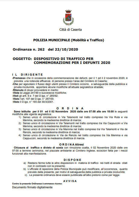 Di seguito l'Ordinanza del Comune di Caserta, giunta in redazione.