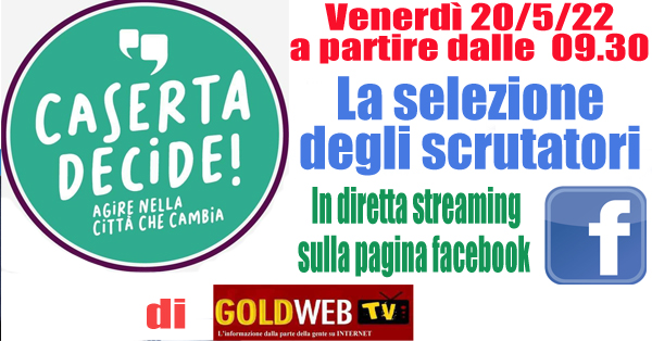 Domani, venerdì 20 maggio 2022, in diretta streaming sulla nostra pagina facebook 'Gold Webtv' seguiremo, a partire dalle ore 9.30, l'incontro del movimento politico 'Caserta Decide' inerente l'iniziativa legata alla selezione degli scrutatori messa in campo proprio dal Consigliere Comunale Giovine e dalla squadra che lo sostiene, in vista del referendum del prossimo mese di giugno.