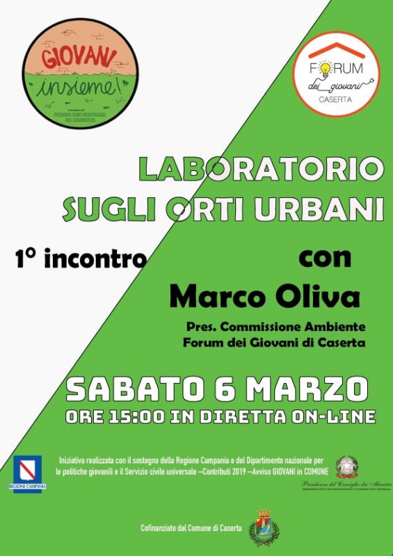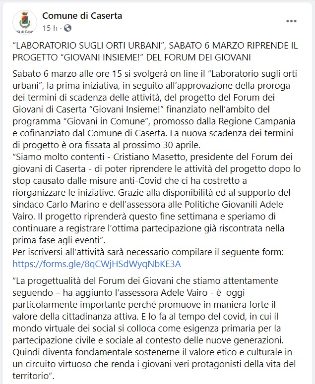 Questo quanto pubblicato sulla pagina fb del Comune di Caserta: "“LABORATORIO SUGLI ORTI URBANI”, SABATO 6 MARZO RIPRENDE IL PROGETTO “GIOVANI INSIEME!” DEL FORUM DEI GIOVANI Sabato 6 marzo alle ore 15 si svolgerà on line il “Laboratorio sugli orti urbani”, la prima iniziativa - si legge nella nota -, in seguito all’approvazione della proroga dei termini di scadenza delle attività, del progetto del Forum dei Giovani di Caserta “Giovani Insieme!” finanziato nell’ambito del programma “Giovani in Comune”, promosso dalla Regione Campania e cofinanziato dal Comune di Caserta. La nuova scadenza dei termini di progetto è ora fissata al prossimo 30 aprile. “Siamo molto contenti - Cristiano Masetto, presidente del Forum dei giovani di Caserta - di poter riprendere le attività del progetto dopo lo stop causato dalle misure anti-Covid che ci ha costretto a riorganizzare le iniziative. Grazie alla disponibilità ed al supporto del sindaco Carlo Marino - si legge nella nota - e dell’assessora alle Politiche Giovanili Adele Vairo. Il progetto riprenderà questo fine settimana e speriamo di continuare a registrare l’ottima partecipazione già riscontrata nella prima fase agli eventi”. Per iscriversi all’attività sarà necessario compilare il seguente form: https://forms.gle/8qCWjHSdWyqNbKE3A “La progettualità del Forum dei Giovani che stiamo attentamente seguendo – ha aggiunto l’assessora Adele Vairo - è oggi particolarmente importante perché promuove in maniera forte il valore della cittadinanza attiva. E lo fa al tempo del covid, in cui il mondo virtuale dei social si colloca come esigenza primaria per la partecipazione civile e sociale al contesto delle nuove generazioni. Quindi - si legge nella nota - diventa fondamentale sostenerne il valore etico e culturale in un circuito virtuoso che renda i giovani veri protagonisti della vita del territorio”."