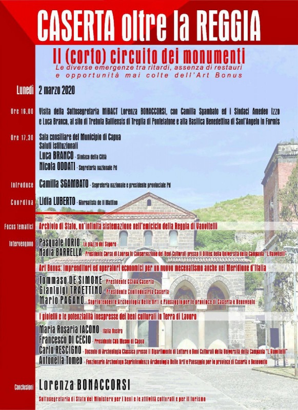 La Sottosegretaria del Ministero per i beni e le attività culturali e per il turismo, Lorenza Bonaccorsi, sarà domani pomeriggio, lunedì 2 marzo, in tour in provincia di Caserta per visitare alcuni siti archeologici e partecipare- si legge nella nota- a diversi focus tematici sulle emergenze che vivono i beni culturali. “CASERTA OLTRE LA REGGIA, il (corto) circuito dei monumenti”, è il titolo scelta per l’iniziativa promossa da Camilla Sgambato, componente della segreteria nazionale e presidente provinciale del Partito Democratico, per discutere delle diverse criticitá che caratterizzano siti, monumenti e beni storici, religiosi e culturali di Terra di Lavoro tra ritardi, assenza di restauri e opportunità mai colte dell’Art Bonus. La sottosegretaria al MiBACT BONACCORSI, insieme a Sgambato ed ai Sindaci di Pontelatone, Amedeo Izzo, e di Capua, Luca Branco, farà tappa alle ore 16 prima al sito di Trebula Balliensis di Treglia di Pontelatone, e poi alla Basilica Benedettina di Sant’Angelo in Formis. A seguire, alle ore 17,30, parteciperà- si legge nel comunicato-. nella sala consiliare del Municipio di Capua, ai tavoli tematici voluti da Sgambato, che saranno aperti dai saluti istituzionali del Primo cittadino Branco, del componente della segreteria nazionale del Pd, Nicola Oddati, e moderati dalla giornalista de Il Martino, Lidia Luberto. Ad introdurre i lavori sarà Sgambato che illustrerà lo stato dell’arte dei beni culturali in provincia di Caserta che gravitano intorno alla Reggia ma senza essere finora messi in connessione tra loro tanto da creare un corto circuito dei monumenti. Tre i focus tematici su altrettanti temi: il primo su “Archivio di Stato, un’infinita sistemazione nell’emiciclo della Reggia di Vanvitelli”, con gli interventi- si legge nella nota- di Pasquale Iorio de Le piazze del Sapere, Nadia Barrella, presidente del corso di laurea in Conservazione dei Beni Culturali presso il Dilbec della Università della Campania “L.Vanvitelli”; il secondo su “I gioielli e le potenzialità inespresse dei beni culturali in Terra di Lavoro”, cui parteciperanno Maria Rosaria Iacono di Italia Nostra, Francesco Di Cecio, presidente del CdA del Museo provinciale Campano di Capua, Carlo Rescigno, docente di Archeologia Classica presso il Dipartimento di Lettere e Beni Culturali della Universitàdella Campania “L.Vanvitelli”, e Antonella Tomeo, funzionario archeologo della Soprintendenza archeologia belle arti e paesaggio per le province di Caserta e Benevento. Il terzo ed ultimo tavolo verterà- si legge nel comuniato- su “Art Bonus: imprenditori ed operatori economici per un nuovo mecenatismo anche nel Meridione d’Italia”, che vedrà i contributi di Tommaso De Simone, presidente della Camera di Commercio di Caserta, Gianluigi Traettino, presidente di Confindustria Terra di Lavoro, e di Mario Pagano, soprintendente Archeologia Belle Arti e Paesaggio per le province di Caserta e Benevento. Le conclusioni saranno- si legge nella nota- affidate a Lorenza Bonaccorsi, sottosegretaria di Stato del Ministero per i beni e le attività culturali e per il turismo. “I beni culturali ed il turismo rappresentano il settore che è stato maggiormente colpito dalla crisi causata dal virus. Perciò credo che la visita della sottosegretaria Bonaccorsi sia particolarmente importante per il nostro territorio, perché avremo modo di affrontare- si legge nel comunicato- insieme temi fondamentali per la nostra provincia, con il contributo prezioso di autorità ed operatori del settore”, dichiara Camilla Sgambato."