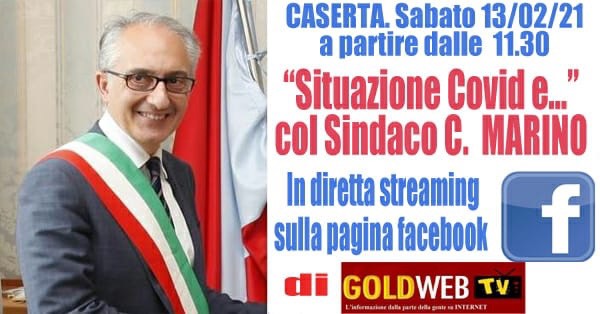 Domani (sabato 13 febbraio) non perdete il nuovo appuntamento sulla pagina fb di Goldwebtv.it, 'Marino risponde ai casertani' con il primo cittadino del comune capoluogo di 'Terra di Lavoro'. Parleremo della situazione covid in citta' alla luce dei nuovi casi, della situazione scuole, del piano vaccinale ma anche dei problemi che riguardano la citta' e delle elezioni comunali in programma a Giugno, salvo posticipi. La diretta iniziera' alle ore 11.30 circa