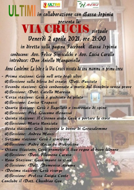 "Domani sera alle 21:00 si terrà una VIA CRUCIS VIRTUALE condotta da Don Aniello Manganiello a cui prenderanno parte, tra gli altri, con interventi e riflessioni: Catello Maresca, Domenico Airoma, Enrico Trapassi, Andrea Manzi e Padre Rocco da Pietrelcina. Se ti fa piacere potrai seguirla in diretta anche sulla pagina Facebook di Ultimi - Caserta."