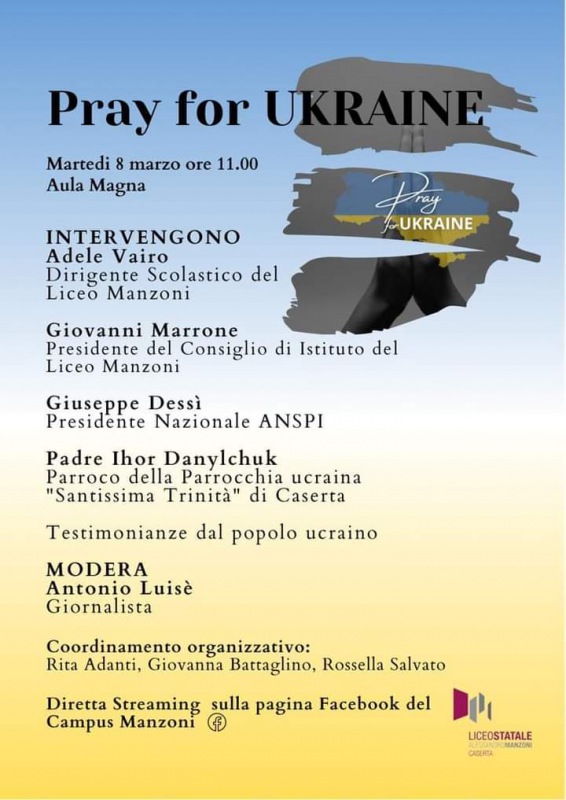 Domani, martedì 8 marzo, alle ore 11 presso l'Aula Magna del Liceo Manzoni si svolgerà l'evento 'Pray for Ukraine'. Interverrà il Dirigente Scolastico del Liceo Manzoni di Caserta, dott.ssa Adele Vairo. Con lei anche il Presidente del Consiglio di Istituto del Liceo Manzoni, Giovanni Marrone, il Presidente Nazionale ANSPI, Giuseppe Dessì, ed il Parroco della Parrocchia ucraina 'Santissima Trinità' di Caserta, Padre Ihor Danylchuk. Modererà l'incontro il giornalista Antonio Luisè. Ricordiamo che è possibile seguire l'evento attraverso la diretta streaming sulla pagina facebook del Campus Manzoni.