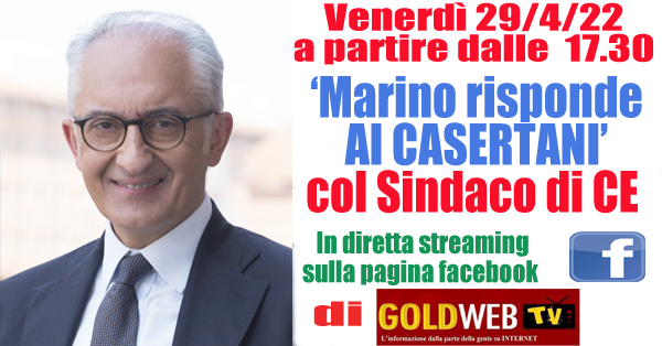 Domani, 29 aprile 2022, a partire dalle ore 17.30 in diretta sulla pagina 'Gold Webtv' torna l'appuntamento 'Marino risponde ai Casertani' con il primo cittadino di Caserta, avv. Carlo Marino. Parleremo degli argomenti di attualità che riguardano la città capoluogo di 'Terra di Lavoro' con uno sguardo alla situazione Covid e approfondiremo il bando per il nuovo stadio della Casertana. Durante la diretta il Sindaco risponderà alle vostre domande.