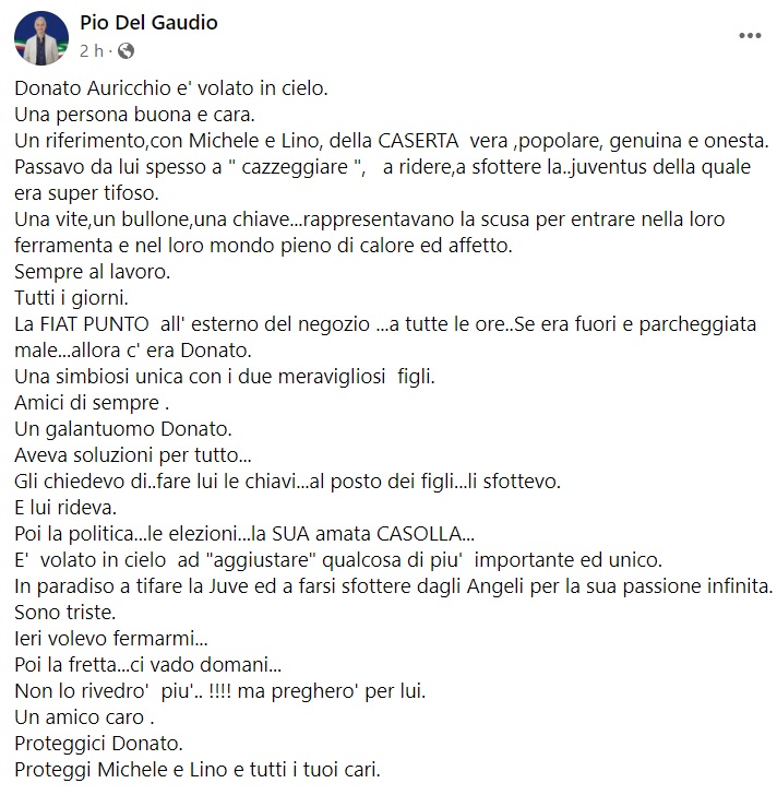 Questo il messaggio di cordoglio che apprendiamo dalla pagina facebook del Cons. Com. di Caserta Pio Del Gaudio: "Donato Auricchio e' volato in cielo. Una persona buona e cara. Un riferimento, con Michele e Lino, della CASERTA vera, popolare - si legge nella nota -, genuina e onesta. Passavo da lui spesso a "cazzeggiare", a ridere, a sfottere la Juventus della quale era super tifoso. Una vite, un bullone, una chiave... rappresentavano la scusa per entrare nella loro ferramenta e nel loro mondo pieno di calore ed affetto. Sempre al lavoro. Tutti i giorni. La FIAT PUNTO all'esterno del negozio... a tutte le ore... Se era fuori e parcheggiata male... allora c'era Donato. Una simbiosi unica con i due meravigliosi figli. Amici di sempre - si legge nella nota -. Un galantuomo Donato. Aveva soluzioni per tutto... Gli chiedevo di fare lui le chiavi... al posto dei figli... li sfottevo. E lui rideva. Poi la politica... le elezioni... la SUA amata CASOLLA... E' volato in cielo ad "aggiustare" qualcosa di piu' importante ed unico. In paradiso a tifare la Juve ed a farsi sfottere dagli Angeli per la sua passione infinita. Sono triste. Ieri volevo fermarmi... Poi la fretta... ci vado domani... Non lo rivedro' piu'!!!! ma preghero' per lui. Un amico caro - si legge nella nota -. Proteggici Donato. Proteggi Michele e Lino e tutti i tuoi cari."