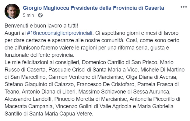 Questo quanto pubblicato sulla pagina facebook del Presidente della Provincia Giorgio Magliocca