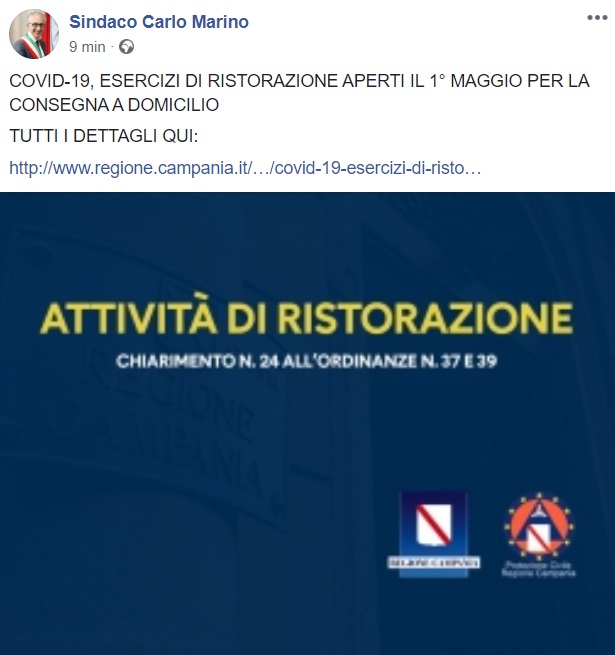 Ce. "Esercizi di ristorazione aperti il 1° maggio per la consegna a domicilio"