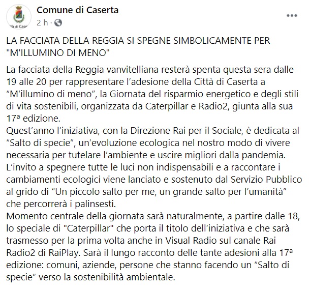 Questo quanto apprendiamo dalla pagina fb del Comune di Caserta: "LA FACCIATA DELLA REGGIA SI SPEGNE SIMBOLICAMENTE PER "M'ILLUMINO DI MENO" La facciata della Reggia vanvitelliana resterà spenta questa sera dalle 19 alle 20 per rappresentare l’adesione della Città di Caserta a “M’illumino di meno”, la Giornata del risparmio energetico e degli stili di vita sostenibili - si legge nella nota -, organizzata da Caterpillar e Radio2, giunta alla sua 17ª edizione. Quest’anno l’iniziativa, con la Direzione Rai per il Sociale, è dedicata al “Salto di specie”, un’evoluzione ecologica nel nostro modo di vivere necessaria per tutelare l’ambiente e uscire migliori dalla pandemia. L’invito a spegnere tutte le luci non indispensabili e a raccontare i cambiamenti ecologici viene lanciato e sostenuto dal Servizio Pubblico al grido di “Un piccolo salto per me, un grande salto per l’umanità” che percorrerà i palinsesti. Momento centrale della giornata - si legge nella nota - sarà naturalmente, a partire dalle 18, lo speciale di "Caterpillar" che porta il titolo dell’iniziativa e che sarà trasmesso per la prima volta anche in Visual Radio sul canale Rai Radio2 di RaiPlay. Sarà il lungo racconto delle tante adesioni alla 17ª edizione: comuni, aziende, persone che stanno facendo un “Salto di specie” verso la sostenibilità ambientale."