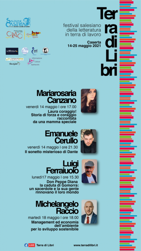Prima giornata di eventi, oggi, per Terra di Libri – festival salesiano della letteratura in Terra di Lavoro, promosso dall’Istituto Salesiano «Sacro Cuore di Maria» di Caserta e dal Laboratorio «Orao» del Cortile dei Gentili di Caserta, che si svolgerà online (sulla pagina Facebook «Terra di Libri» e su www.terradilibri.it) dal 14 al 25 maggio. La prima a calcare il palco digitale, alle 17.00, e ad aprire, così, il festival è Mariarosaria Canzano – docente di scuola secondaria di secondo grado e già cultrice della materia in pedagogia e sociologia presso l’Università di Cassino – che presenterà - si legge nella nota - il suo «Laura coraggio! Storia di forza e coraggio raccontata da una mamma speciale» edito per i tipi della Booksprint Edizioni. Il testo è una lunga dedica alla figlia Laura, autistica, la cui storia è raccontata come un inno di coraggio, forza e speranza. Il racconto esperienziale – dalla scoperta all’accettazione del disturbo dello spettro autistico di Laura – sarà calato, durante la presentazione, nell’attualità dell’autismo con particolare attenzione alla delicata situazione campana ed alle proteste che stanno accompagnando, in questi giorni, la riforma che vede ridurre drasticamente le ore di terapia ABA a disposizione dei giovani autistici. A dialogare con l’autrice - si legge nella nota - ci saranno Domenico Bove (medico specialista in neuropsichiatria infantile) e Michele Falco (psicologo psicoterapeuta, esperto in terapia ABA). Modera l’incontro Martina Orecchio, giornalista di NanoTv. Ad aprire la presentazione, i saluti di don Antonio D’Angelo, direttore dell’Istituto Salesiano di Caserta. In serata, alle 21.30, incontro con il poeta e blogger napoletano Emanuele Cerullo – a cura del collettivo culturale Nottetempo – per parlare del suo «Il sonetto misterioso di Dante» celebrando il settecentenario della morte del Sommo Poeta anche in occasione del Festival. Il testo, una rielaborazione della sua tesi magistrale di Cerullo, è un lavoro di ricerca sul «sonetto della Garisenda» (una delle torri di Bologna) che l’autore attribuisce a Dante approfondendo anche il rapporto tra Dante e Bologna - si legge nella nota - oltre i temi linguistici. Nell’occasione si parlerà anche del ruolo dell’intellettuale oggi – tra impegno politico, cultura ed accademismo – riproponendo anche l’esperienza personale di Cerullo nel quartiere natio di Scampia. A dialogare con l’autore ci saranno Antonio Di Lorenzo e Francesco Ricciardi – a loro volta autori e speaker radiofonici del programma Nottetempo, in onda ogni martedì sera su Radio Primarete – in un esperimento di multicasting social che vedrà l’evento trasmesso sia sulla pagina di riferimento del Festival che su Instagram sul profilo Nottetempo."