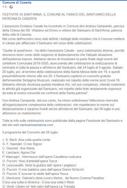 CE. FESTIVITA' DI SANT'ANNA. COMUNE AL FIANCO DEL SANTUARIO DELLA PATRONA DI CASERTA