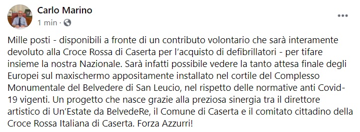 "Mille posti - disponibili a fronte di un contributo volontario che sarà interamente devoluto alla Croce Rossa di Caserta per l’acquisto di defibrillatori - per tifare insieme la nostra Nazionale. -Si legge nella nota- Sarà infatti possibile vedere la tanto attesa finale degli Europei sul maxischermo appositamente installato nel cortile del Complesso Monumentale del Belvedere di San Leucio, nel rispetto delle normative anti Covid-19 vigenti. -Si legge nella nota- Un progetto che nasce grazie alla preziosa sinergia tra il direttore artistico di Un’Estate da BelvedeRe, il Comune di Caserta e il comitato cittadino della Croce Rossa Italiana di Caserta. Forza Azzurri!"