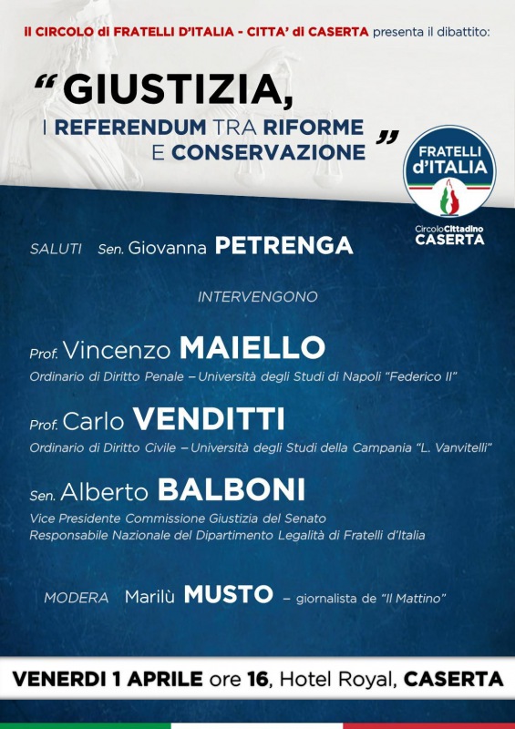 "Venerdì 1 aprile alle ore 16.00, presso l’Hotel Royal di Caserta, in occasione degli imminenti referendum sulla giustizia, il Circolo di Fratelli d’Italia – Città di Caserta presenterà il dibattito dal titolo “Giustizia, i referendum tra riforme e conservazione”. L’incontro, che approfondirà- si legge nella nota- gli aspetti tecnici dell’appuntamento referendario, sarà introdotto dalla Sen. Giovanna Petrenga e moderato dalla giornalista de “Il Mattino” Marilù Musto, e si avvarrà dei contributi scientifici del Prof. Vincenzo Maiello e del Prof. Carlo Venditti, “quali esperti indipendenti”, oltre che dell’intervento del Sen. Alberto Balboni, Vice Presidente Commissione Giustizia del Senato."