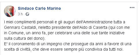 "I miei complimenti personali e gli auguri dell'Amministrazione tutta a Gennaro Castaldi, rieletto presidente dell'Aido di Caserta (qui con me in Comune, un anno fa, per celebrare una delle sue tante iniziative sulla cultura del dono). E' il coronamento di un impegno che prosegue da anni a favore di una scelta di civiltà, che deve essere sempre più condivisa da tutti noi."