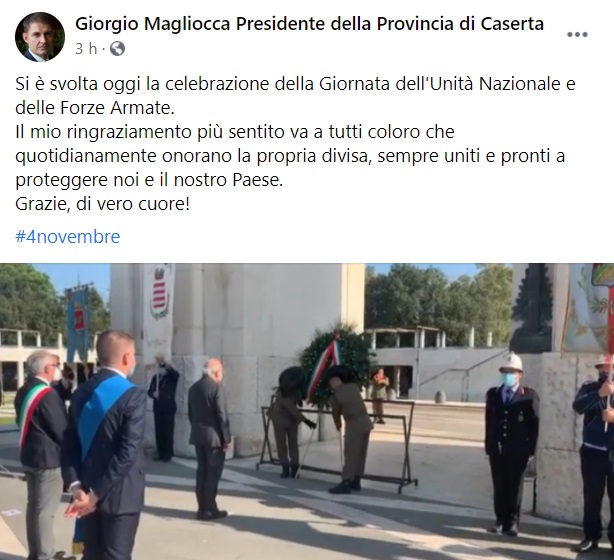Ce. Giornata dell'Unità Nazionale e delle forze armate. Magliocca: "Mio ringraziamento a colore che onorano la propria divisa"