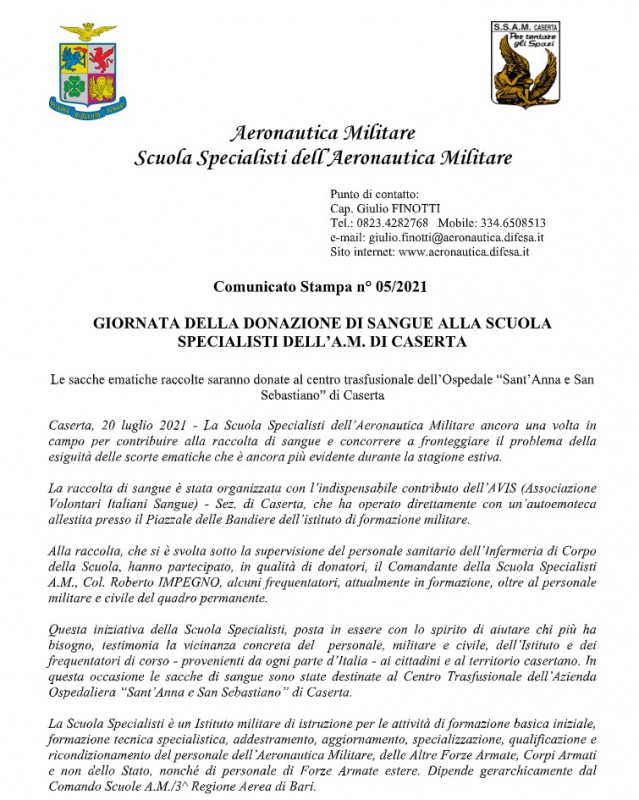 "GIORNATA DELLA DONAZIONE DI SANGUE ALLA SCUOLA SPECIALISTI DELL’A.M. DI CASERTA. Le sacche ematiche raccolte saranno donate al centro trasfusionale dell’Ospedale “Sant’Anna e San Sebastiano” di Caserta Caserta, 20 luglio 2021 - La Scuola Specialisti dell’Aeronautica Militare ancora una volta in campo per contribuire alla raccolta di sangue e concorrere a fronteggiare il problema della esiguità delle scorte ematiche che è ancora più evidente durante la stagione estiva. La raccolta di sangue- si legge nella nota- è stata organizzata con l’indispensabile contributo dell’AVIS (Associazione Volontari Italiani Sangue) - Sez. di Caserta, che ha operato direttamente con un’autoemoteca allestita presso il Piazzale delle Bandiere dell’istituto di formazione militare. Alla raccolta, che si è svolta sotto la supervisione del personale sanitario dell’Infermeria di Corpo della Scuola, hanno partecipato, in qualità di donatori, il Comandante della Scuola Specialisti A.M., Col. Roberto IMPEGNO, alcuni frequentatori, attualmente in formazione, oltre al personale militare e civile del quadro permanente. Questa iniziativa della Scuola Specialisti, posta in essere con lo spirito di aiutare- si legge nella nota- chi più ha bisogno, testimonia la vicinanza concreta del personale, militare e civile, dell’Istituto e dei frequentatori di corso - provenienti da ogni parte d’Italia - ai cittadini e al territorio casertano. In questa occasione le sacche di sangue sono state destinate al Centro Trasfusionale dell’Azienda Ospedaliera “Sant’Anna e San Sebastiano” di Caserta. La Scuola Specialisti è un Istituto militare di istruzione per le attività di formazione basica iniziale, formazione tecnica specialistica, addestramento, aggiornamento, specializzazione, qualificazione e ricondizionamento del personale dell’Aeronautica Militare, delle Altre Forze Armate, Corpi Armati e non dello Stato, nonché di personale di Forze Armate estere. Dipende gerarchicamente- si legge nella nota- dal Comando Scuole A.M./3^ Regione Aerea di Bari."