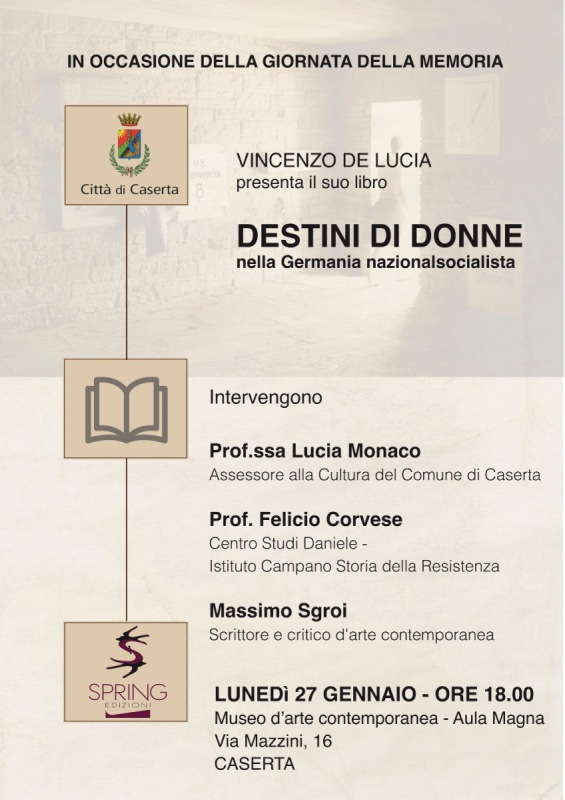 In occasione della Giornata della Memoria, oggi pomeriggio alle ore 18 presso l'Aula magna del Museo d'arte contemporanea in via Mazzini a Caserta, vi sarà la presentazione del libro di Vincenzo De Lucia dal titolo "Destini di Donne nella Germania nazionalsocialista".